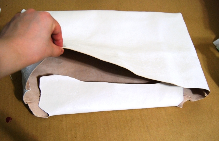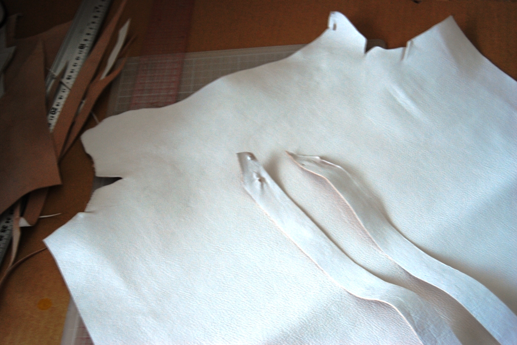 1、革をかばんの形に切り抜く(本体1枚、取っ手2枚)